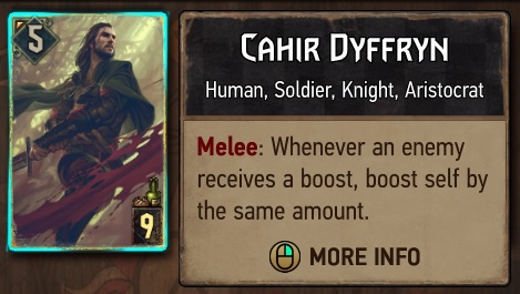 یکی از این کارت های خطرناک Cahir Dyffryn ئه که یکی از کلفت ترین کارت های Nilfgaard ئه. این کارت به این صورته که هر وقت شما خودتون رو Boost کنید، این هم خودش رو به همون تعداد Boost می کنه و عملا یک تنه می تونه کل تاکتیک شما رو به فنا بده. اوضاع وقتی بدتر می شه که رقیب شما Letho: Kingslayer رو هم داشته باشه و اون رو تبدیل به همین Cahir بکنه. اون موقع به ازای هر Boost ای که شما می شین، رقیبتون 2 تا Boost می شه و رسما به فنا می رین. البته راه های مقابله باهاش کم نیست. ساده ترین کار اینه که همین که گذاشته شد بکشیدش. اگه نه قفلش کنید یا از اون جایی که این کارت فقط توی سطر Melee موثره، می تونید Move اش هم بکنید. البته ممکنه این کارت در کنار Defender قرار بگیره. اون موقع دیگه به این راحتی ها نمی شه جلوشو گرفت و باید دست به دامن کارت Geralt: Yrden بشین. این کارت، امتیاز همه ی کارت های یک سطر رو Reset می کنه و Cahir رو به حالت اولش که تنها 5 امتیاز داشت بر می گردونه. ضمن اینکه می شه Defender رو با کشتن یا Move یا Purify کردن از سر راه برداشت و به نحوی مثلا با استفاده از کارت خود Geralt of Rivia ( نه Geralt: Yrden ) Cahir رو از میان برداشت.