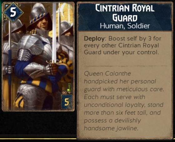 استفاده از حداقل یه تاکتیک به عنوان Plan B کاریه که بسیار توصیه می شه. ممکنه به هر نحوی کارت هایی که می خواین به دستتون نیاد، برای همین باید یه تاکتیک دوم هم برای کارتون در نظر بگیرید. خیلی از افرادی که از قدرت لیدر Uprising استفاده می کنن، تاکتیک Kaedweni Revenant رو با استفاده از Caravan Vanguard و Draug پیاده سازی می کنن، این تاکتیک به قدری خز شده که تنها کسی که اون رو نمی دونه خواجه حافظ شیرازیه که ایشون هم کلا به Gwent علاقه ای نداشت. بنابراین ما می خوایم از تاکتیک دیگه ای که توسط Cintrian Royal Guard ها استفاده می شه، بهره بجوییم.
