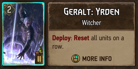 یکی دیگه از این کارت های خطرناک، همین Geralt: Yrden ئه که ذکر خیرش شده بود. این کارت هم می تونه کل Boost هایی که توی یه سطر اتفاق افتاده رو به فنا بده و اون هارو به حالت اولش برگردونه و متاسفانه این جا دیگه نمی شه کاریش هم کرد و به قول پیمان یوسفی آب رفته به جوی برنمی گرده. تنها کاری که می شه کرد اینه که کارت ها رو توی دو سطر بازی پخش کنیم تا اثر این کارت و همچنین چند تا کارت مشابه که با سطر کار می کنند رو کمتر کنیم.