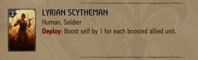 همون طور که می بینید این کارت خودش رو به تعداد کارت هایی که Boost شدند، Boost می کنه. مثلا اگه 10 تا کارت شما قبلا Boost شده باشند، Lyrian Scytheman می تونه براتون 13 امتیاز رو بیاره که تفاوت قابل توجهی در امتیازات بازی ایجاد می کنه. منتهی شرطش اینه که باید بتونید کارت هاتون رو Boost کنید و مسلما 3 تا Boost ای که لیدر به شما می ده کافی نیست، بنابراین باید کارت هایی رو همراه خودتون ببرین که خودشون توانایی Boost رو داشته باشن.