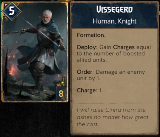 یکی دیگر از کارت هایی که توی این Deck خیلی مهم و تاثیرگذاره، کارت Vissegerd ئه. این کارت به تعداد کارت هایی که Boost شدن، شارژ می گیره و به ازای هر شارژ دریافتی می تونه یک Damage به هر کارت انتخابی از حریف بزنه. یجورایی حالت مکمل Lyrian Scytheman رو داره و خیلی خوب و جوابه. فقط حواستون باشه که این کارت حالت Formation رو داره؛ یعنی اگه تو سطر Melee قرار بگیره، می تونید در همین لحظه از شارژ هاش استفاده کنید ولی اگه توی سطر Range بذاریدش، یدونه Boost می شه منتهی فقط می تونید از شارژهاش تو Turn های بعدی استفاده کنید.