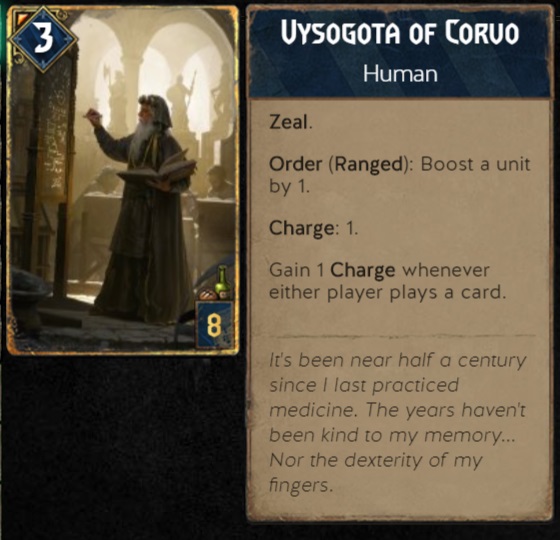 یکی از بهترین کارت هایی که می تونه این کار رو برای شما بکنه Vysogota of Corvo ئه. این کارت به ازای هرکارتی که در بازی Play می شه یک شارژ می گیره و با هر شارژش می تونه یک کارت رو Boost کنه. ولی قدرت پایه ی خودش خیلی کمه (فقط 3 تاست) و می تونه به راحتی توسط حریف نابود بشه، برای جلوگیری از این موضوع می تونید بهش Shield بدین، با لیدر حداقل دو سه تا Boost اش کنید یا اون رو کنار Defender قرار بدین. Defender ها جلوی مورد هدف قرار گرفتن کارت های درون یک سطر رو می گیرن و ازشون به خوبی محافظت می کنند.