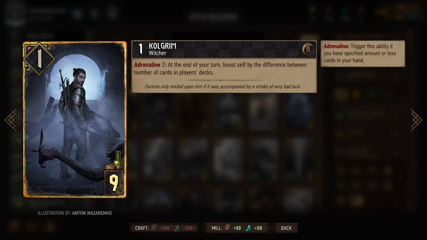 حالا می‌رسیم به کلید واژه‌های جدید بازی؛ اول از همه می‌خوام به مفهوم Adrenaline که به بازی اضافه شده اشاره کنم. آدرنالین با تعداد کارت‌هایی که در حال حاضر تو دست ماست کار داره؛ به این صورت که برای مثال اگه روی یک کارت نوشته شده باشه که در قبال Adrenaline 3 یک کار خاصی رو انجام می‌ده، به این معنیه که اگه ما توی دستمون 3 یا کمتر از 3 عدد کارت داشته باشیم، اون قابلیت خاص فعال می‌شه. من خیلی با این مفهوم حال کردم. آدرنالین باعث می‌شه که ما مجبور شیم از کارت‌ها، برای بهره‌ی بیشتر بردن در زمان‌های خاصی از بازی استفاده کنیم و این قابلیت می‌تونه علاوه بر کارت‌های جدید، روی کارت‌های قدیمی هم اعمال بشه و اون‌ها از بلامصرفی در بیاره. کما این که با استفاده از همین آدرنالین، کارت‌های خیلی ضعیف Vesemir و Lambert و Eskel دچار تغییر شدن و حالا دیگه می‌شه به استفاده ازشون فکر کرد.